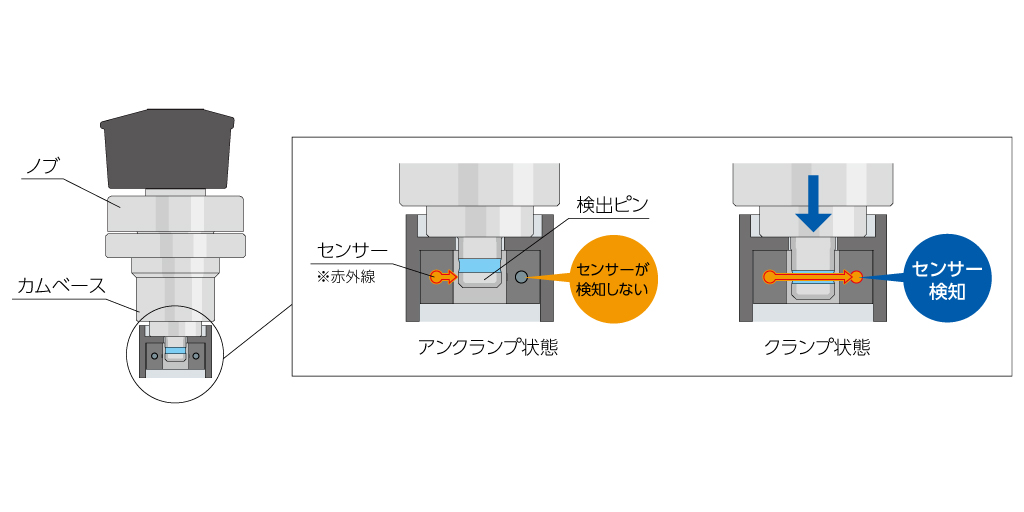 ノブを90°回転するだけで位置決めとクランプが同時にできる製品です。