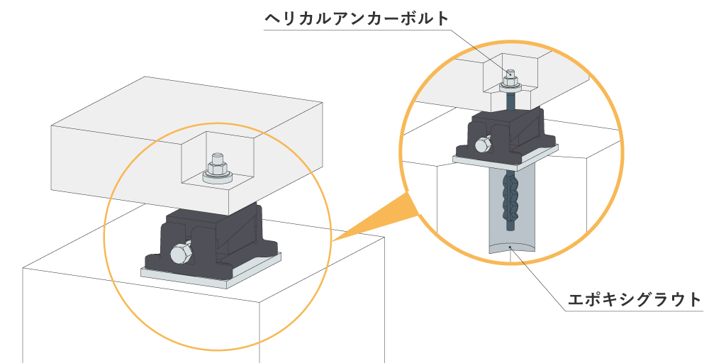 圧縮/引張/接着強度に優れたエポキシグラウトと階段形状のアンカーボルトを組み合せて使用することで、設備と基礎を強固に締結でき、耐震/剛性能力が向上。