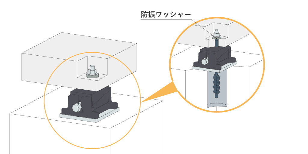 防振レベリングブロックと組み合わせて使用することで、ボルトから伝わる振動を減衰する防振ワッシャーがあります