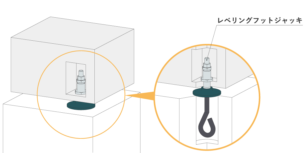 レベリングフットジャッキ、レベリングジャッキは工場フロアのバラつき(凸凹)が大きいエリアで活用できます。
