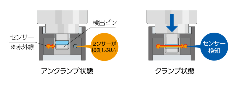センサーでクランプ/アンクランプ状態を検知。