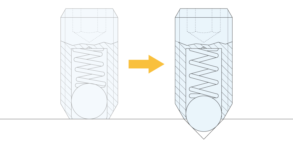 水平(横)方向の荷重が加わると、先端のボールが転がり内部へ押し戻される構造のため、スライド機構の位置決めに適しています。