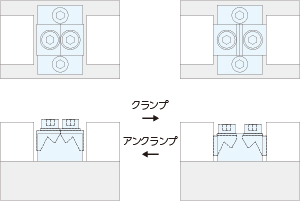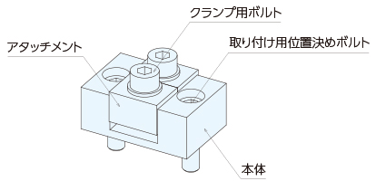 クランプ用ボルトを締め付け方向に回転することで、アタッチメントが本体クサビ形状に沿って下降し、クランプ面が水平に張り出してクランプします。