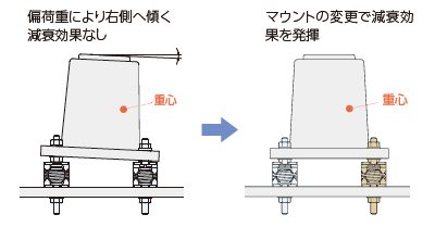 また搭載装置が偏荷重であっても、製品それぞれの許容荷重域を組み合わせることで減衰効果を発揮します