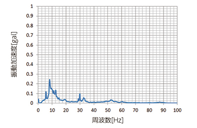【結果】(共振周波数付近約8Hz)では増幅が見られたものの、30Hzおよび52Hzの振動成分を大幅に低減することで、電子てんびんの数値が安定した。
