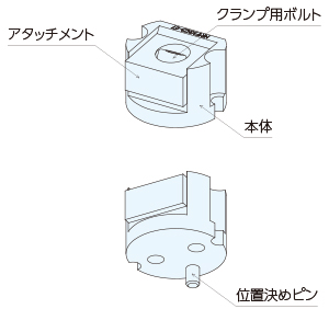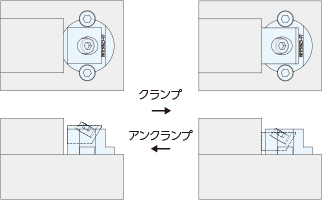クランプ用ボルトを締め付け方向に回転することで、アタッチメントが本体クサビ形状に沿って下降し、クランプ面が水平に張り出してクランプします。