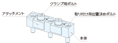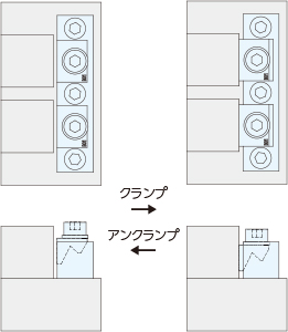 クランプ用ボルトを締め付け方向に回転することで、アタッチメントが本体クサビ形状に沿って下降し、クランプ面が水平に張り出してクランプします。