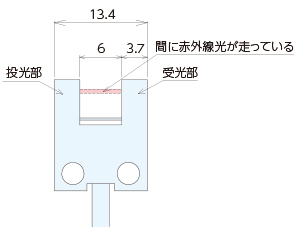 センサーの検出は、投光部から出ている赤外線光が反対側の受光部に届くことで検出します。