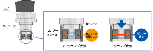 本製品は別売りの「クイックターンクランプ ノブ」各種と組み合わせて使用する製品です。 カムベースに搭載したセンサーによりクランプ/アンクランプ状態を検出することが可能です。