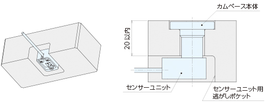 20mmを超える板厚のプレートに取り付けたい場合、プレート裏面にセンサーユニットが干渉しないよう逃がしポケットを 加工することで取り付け可能となります。