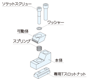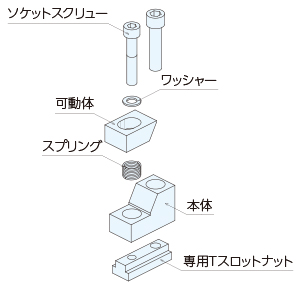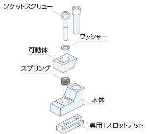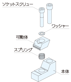 ジグベースにクサビクランプ(クランプ部またはストッパー部)を付属のソケットスクリューで取り付けてください。本体側と可動側でタップサイズが異なりますのでご注意ください。