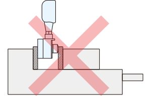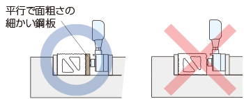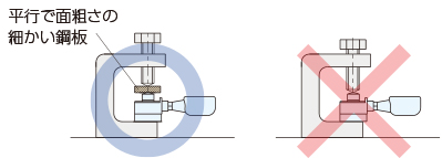 鋳物製品など表面が粗いもので荷重を加える、またはアタッチメントより荷重を加える側の面積が小さい場合は平行で面粗さの細かい鋼板を間に挟み測定をしてください。