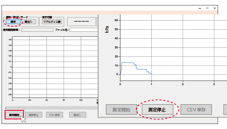 PC側で測定モードになっていることを確認後、画面下の「測定開始」ボタンをクリックすると測定が開始されます。