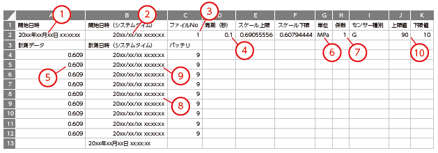 ①開始ボタン日時 ②計測1回目日時 ③CSVファイルの設定タイム ④サンプリングの設定タイム ⑤圧力値