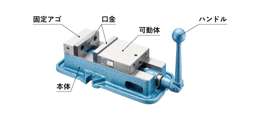 一例として、手締め式マシンバイスは以下の部品と役割で構成されています。